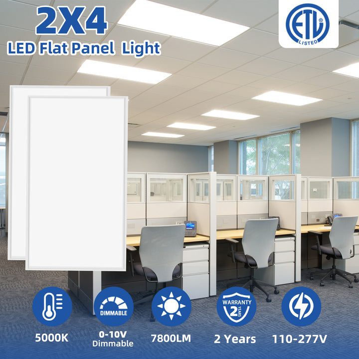 Upgrade lighting with our 2×4 LED flat panel light 4-pack. 7800 lm, 5000 K daylight white, 0-10 V dimmable and edge-lit — perfect for offices, warehouses & retail stores.