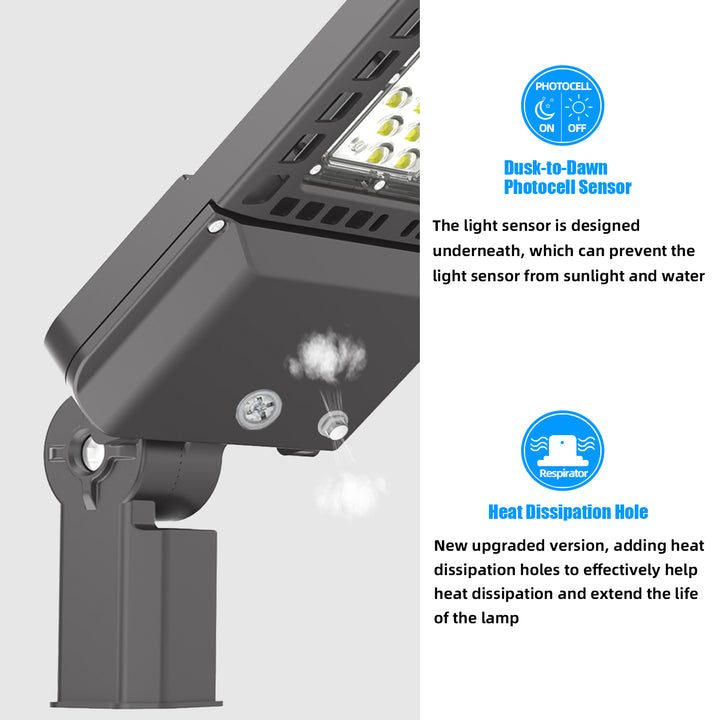 - ✔Easy Installation & Adjustment - Featuring a universal mounting bracket (compatible with 2.5"-diameter poles). Simply mount the shoebox light onto the slip-fit bracket, secure it to the round pole, tighten the screws, and connect the wiring. Features 0 -180° adjustable lighting for precise directional control.