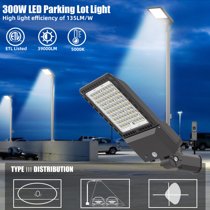 High-brightness 300W LED parking lot light with dusk-to-dawn photocell, 39,000LM output, IP65 waterproof, slip-fitter mount—ideal for yards, driveways, and commercial areas.